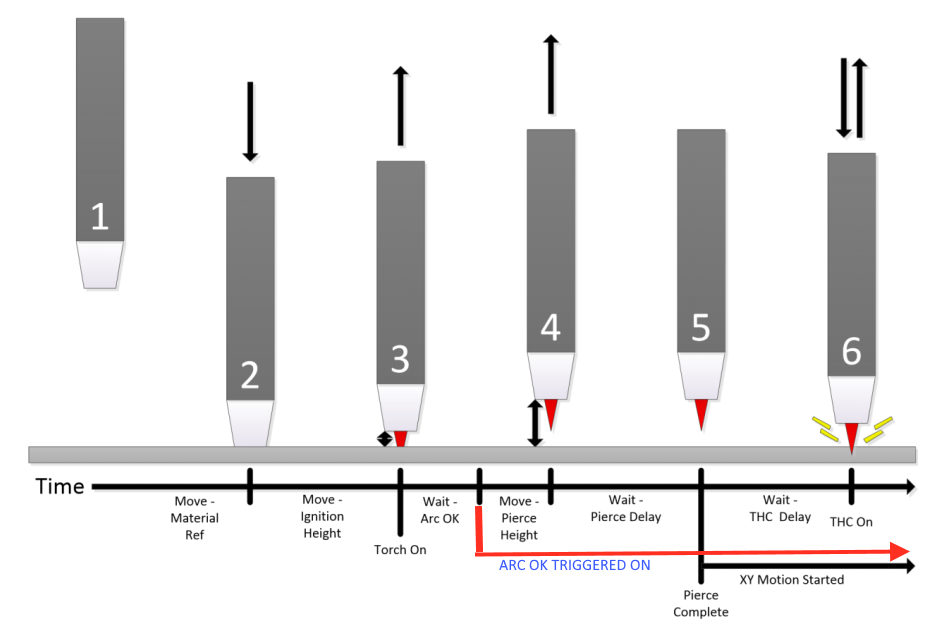 The 'Torch Height Control' feature of the HiCON motion controller waits for the 'Arc OK' signal after the torch head lifts to the ignition height and turns ON. If the 'Arc OK' signal is not detected, the THC sequence will be aborted by the controller. The following image shows the steps in a 'Plasma-cut' sequence.