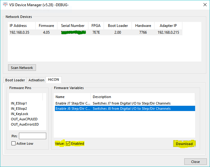 On your VSI Device Manager, select your HiCON motion controller and select "HiCON" tab Check "Value Enabled" and hit on "Download" button. This ensures that 7737 that you are going to use with J7/J8 is going to switch from I/O to Step/Dir Channels.